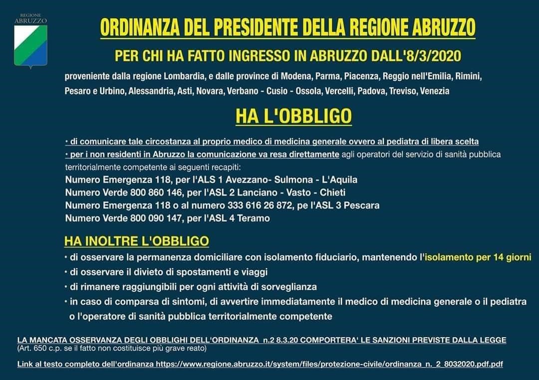 Con Ordinanza del Presidente della Giunta Regionale si ordina che tutti gli individui che hanno fatto ingresso in Abruzzo con decorrenza dalla data del 08/03/2020 provenienti dalla Regione Lombardia e dalla province di Modena, Parma, Piacenza, Reggio nell’Emilia, Rimini, Pesaro e Urbino, Alessandria, Asti, Novara, Verbano-Cusio-Ossola, Vercelli, Padova, Treviso e Venezia, sono obbligati a comunicare tale circostanza al proprio medico di medicina generale. Per maggiori informazioni consultare l’Ordinanza allegata di seguito.