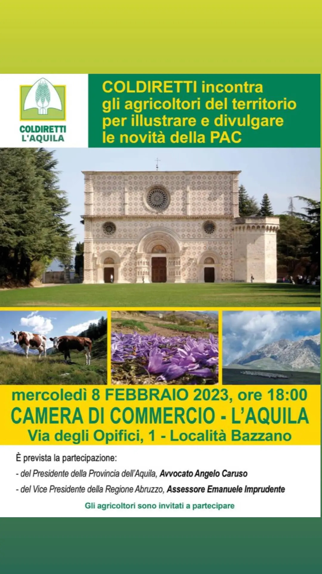 Mercoledì 8 Febbraio c.m. presso la Camera di Commercio di L'Aquila COLDIRETTI incontra gli agricoltori del territorio per illustrare e divulgare le novità della P.A.C.