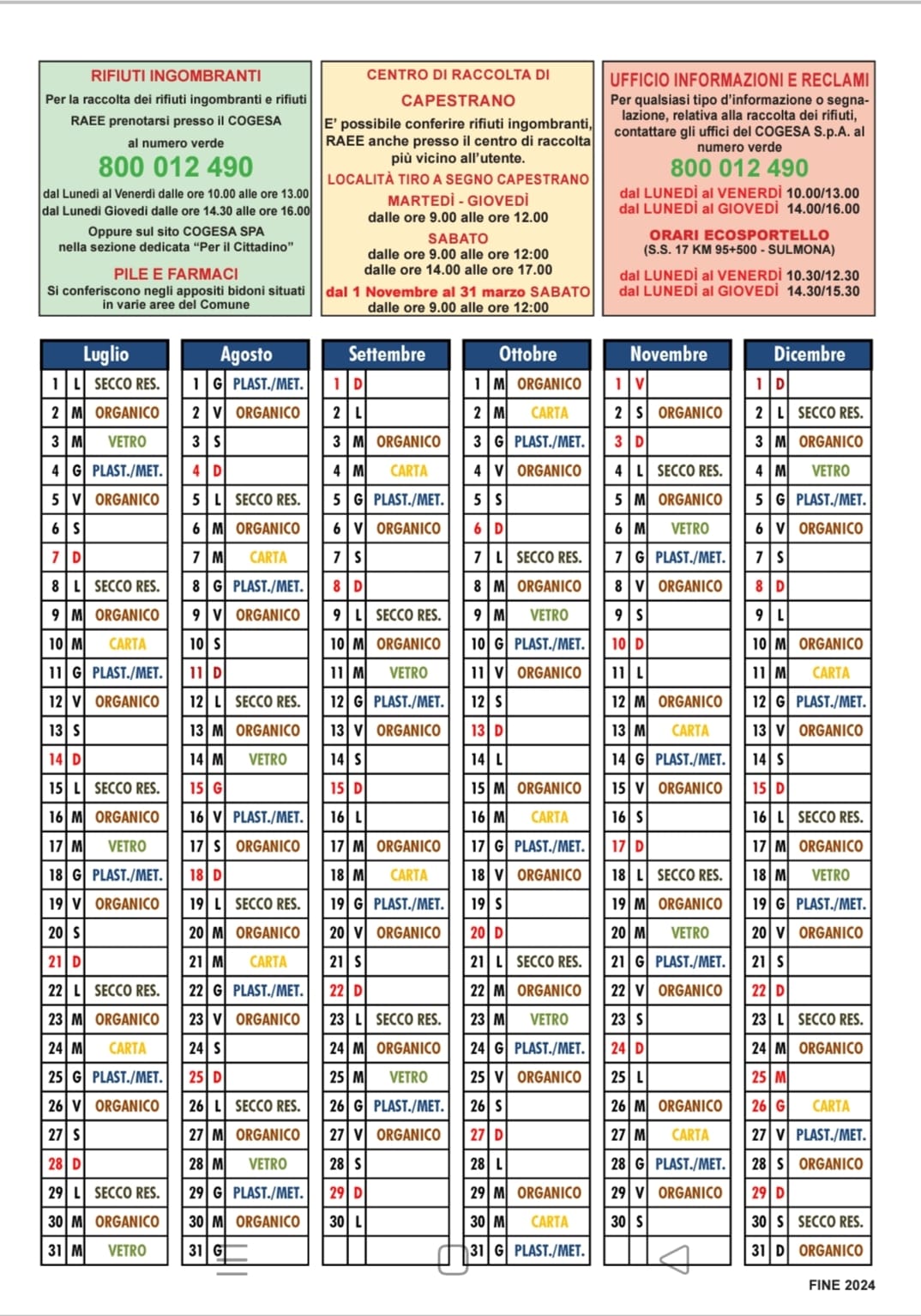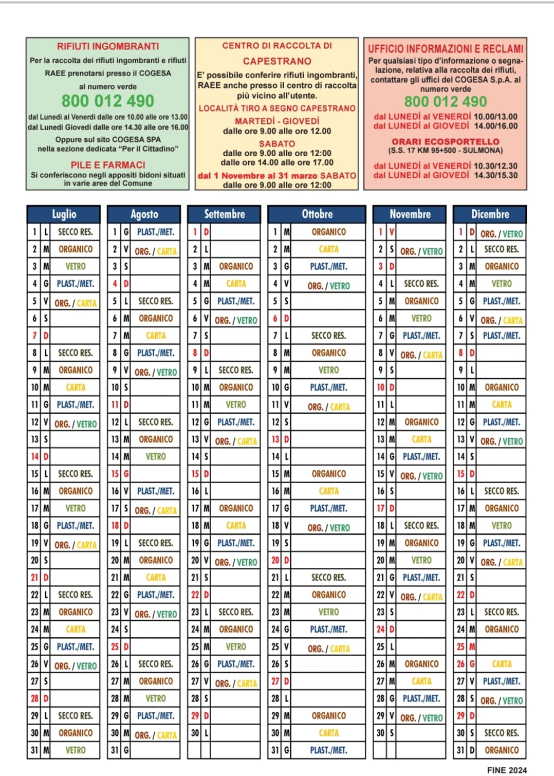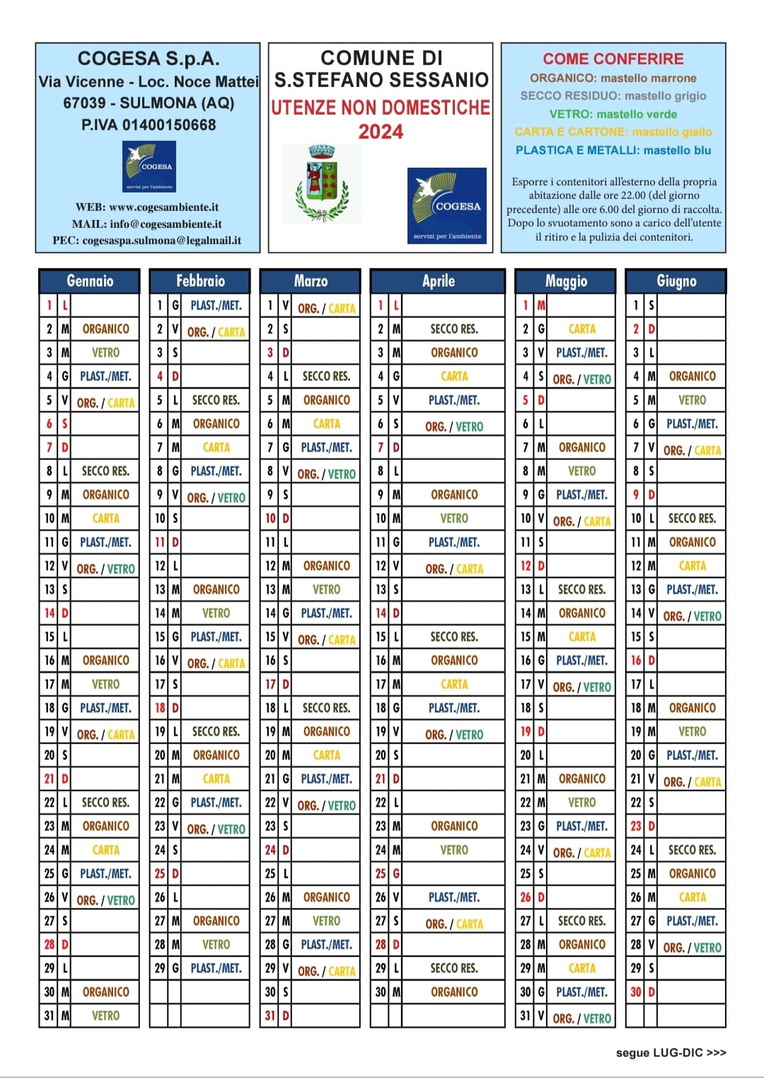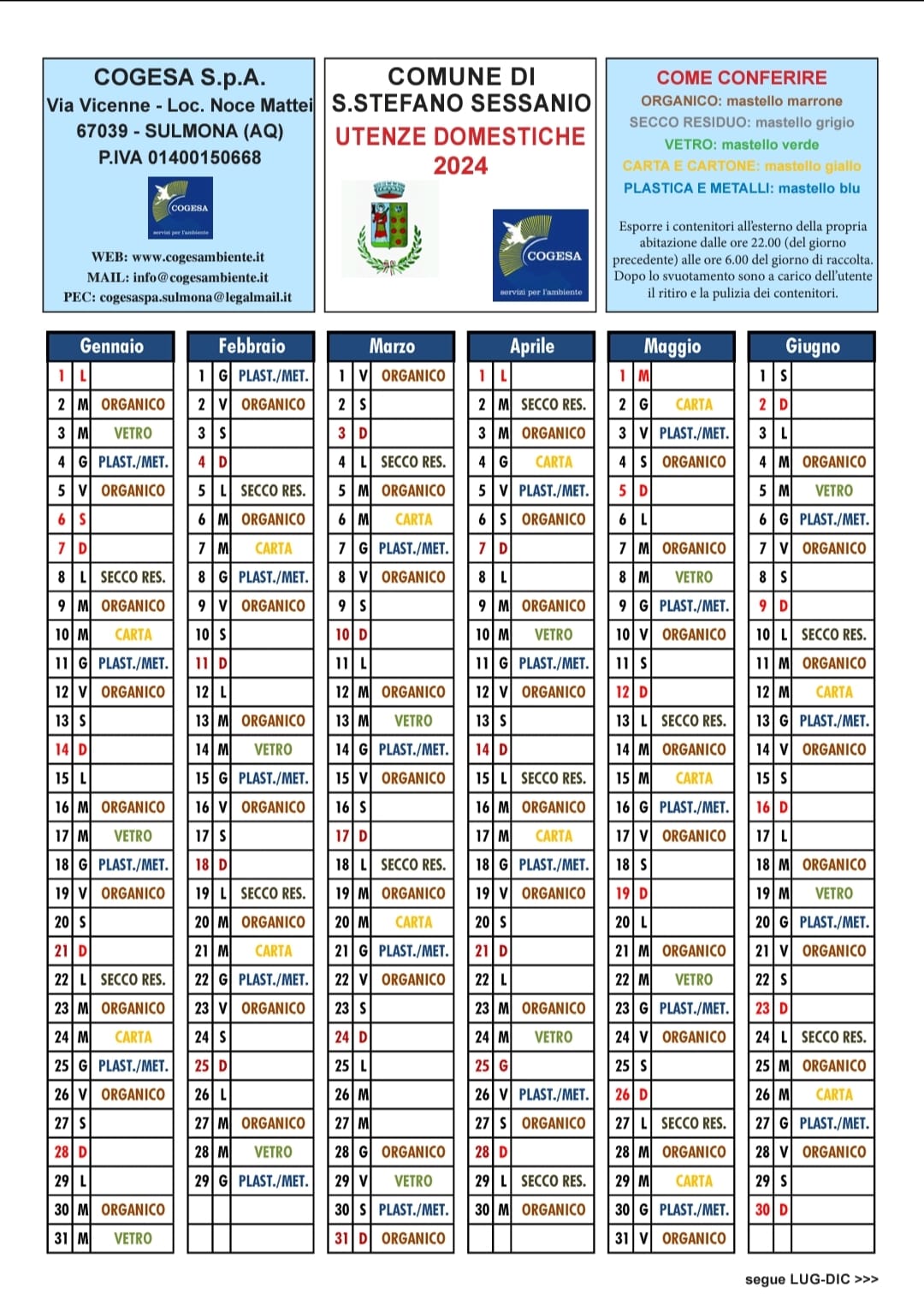 Si rende noto che COGESA s.p.a. ha reso noto il Calendario 2024 della raccolta rifiuti porta a porta relativo alle Utenze Domestiche ed alle Utenze Non Domestiche.