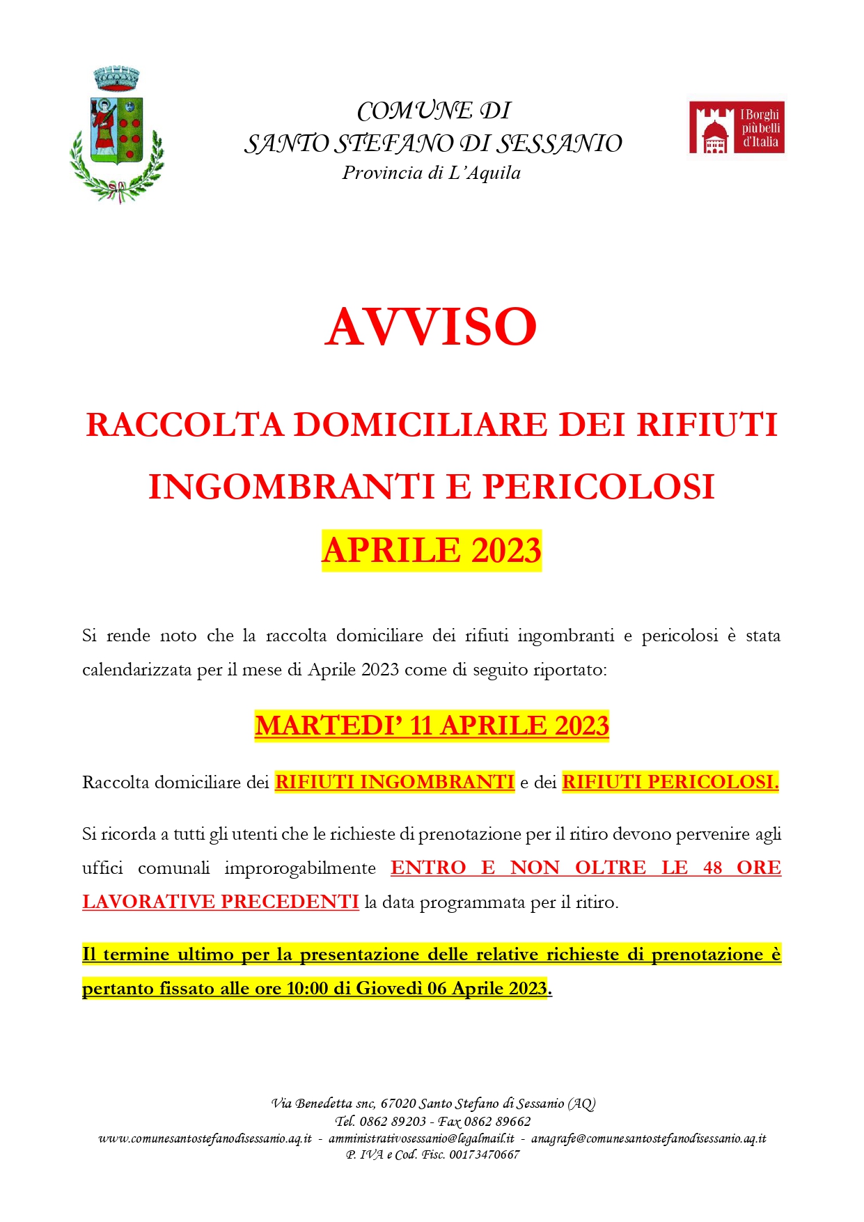 RACCOLTA DOMICILIARE DEI RIFIUTI INGOMBRANTI E PERICOLOSI - APRILE 2023