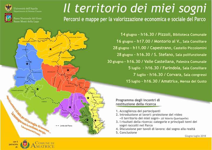Ha preso il via nei giorni scorsi la ricerca territoriale denominata "Il territorio dei miei sogni" condotta dall'Università dell'Aquila attraverso la Prof.ssa Lina Calandra (laboratorio Cartolab) e che percorre una "strada innovativa" per la redazione del "Piano Pluriennale Economico e Sociale del Parco "a partire dai sogni dei suoi abitanti.
