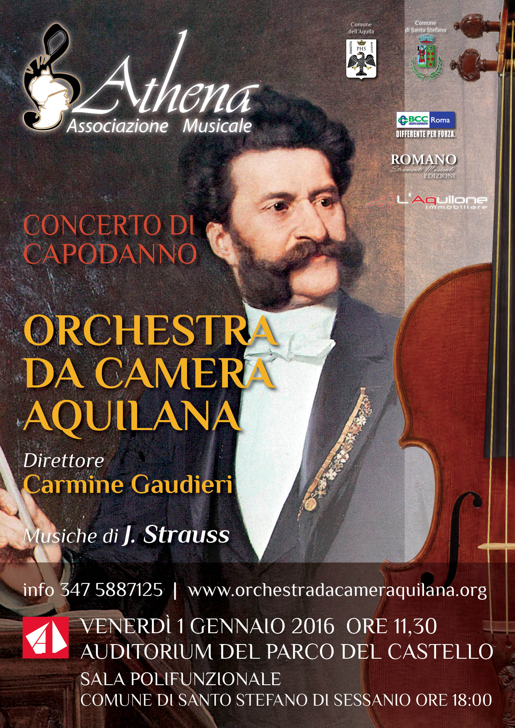 L'Associazione Musicale Athena, in collaborazione con il Comune di Santo Stefano di Sessanio, organizza il CONCERTO DI CAPODANNO, eseguito dall'Orchestra da Camera Aquilana, Direttore Carmine Gaudieri, con musiche di J. Strauss, venerdì 1 gennaio 2016, ore 18.00, presso la Sala Polifunzionale della Sede Municipale di Santo Stefano di Sessanio.