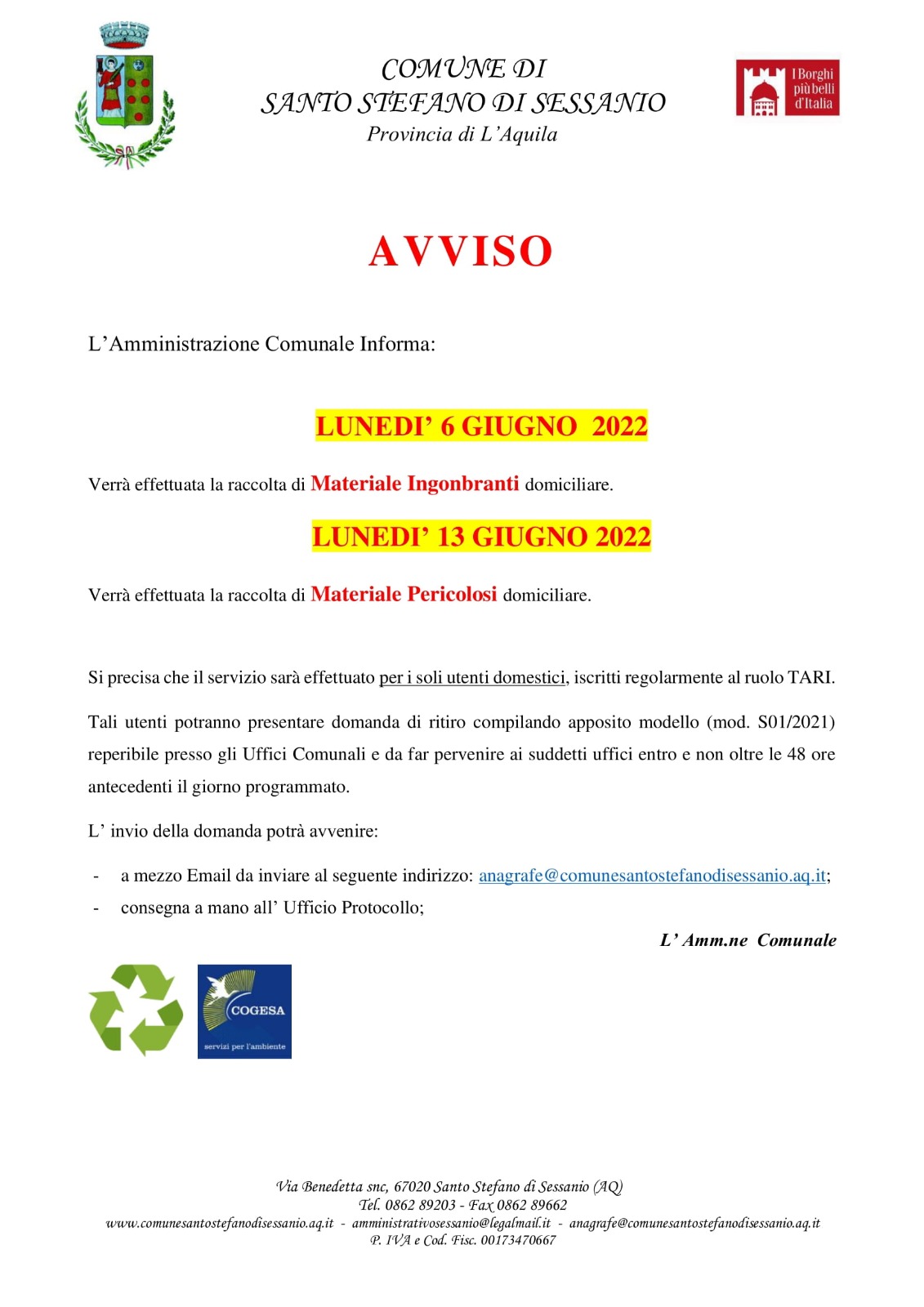 Si comunica che la raccolta domiciliare dei rifiuti ingombranti e pericolosi per i mesi di Giugno e Luglio 2022 è stata calendarizzata come di seguito riportato: